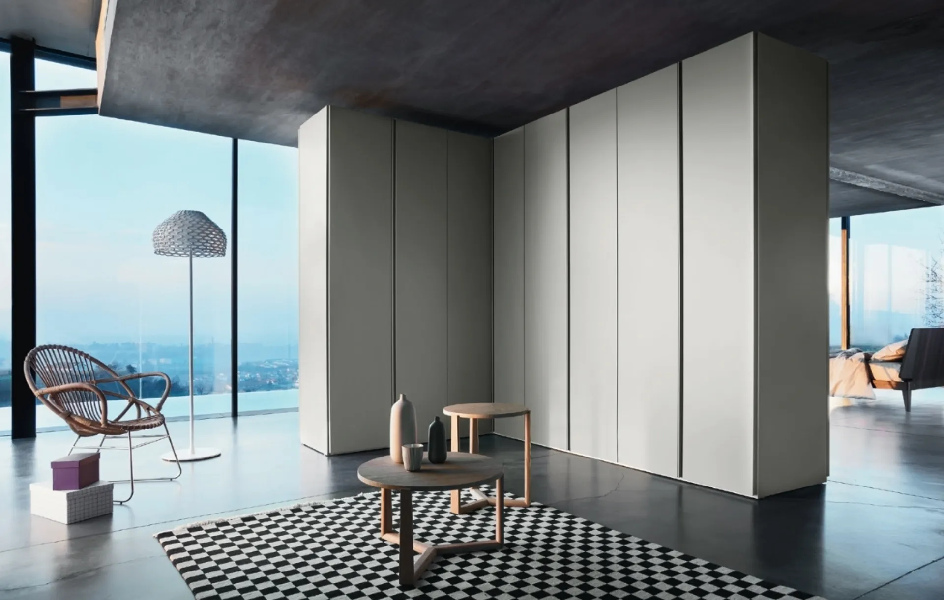 Modèle Sinua avec portes battantes laquées mates conçu pour un espace nuit aux références modernes : découvrez les solutions d'angle