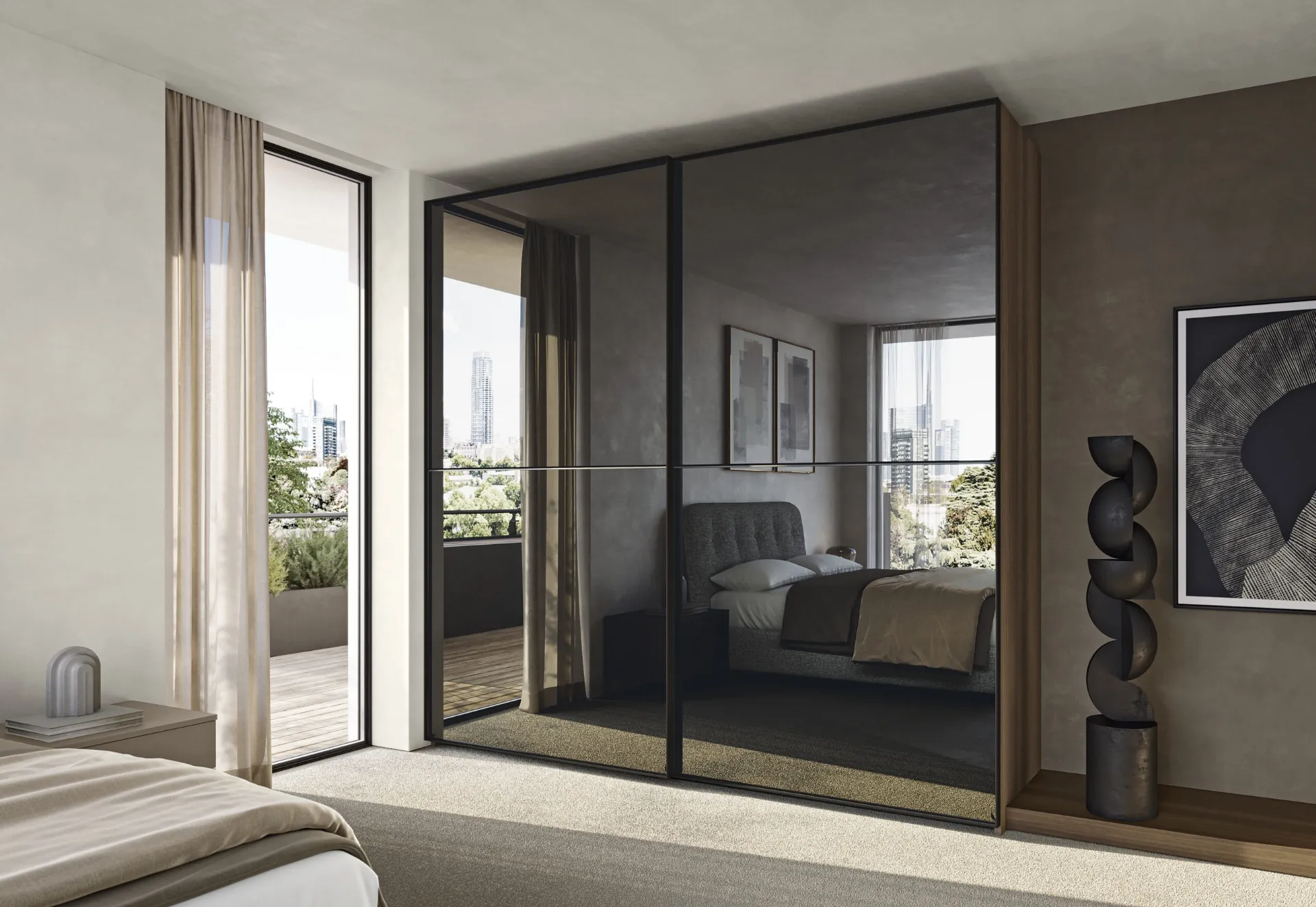 Tu cherches une armoire en verre ? Clique et découvre les dressings murales avec portes coulissantes de Colombini Casa.
