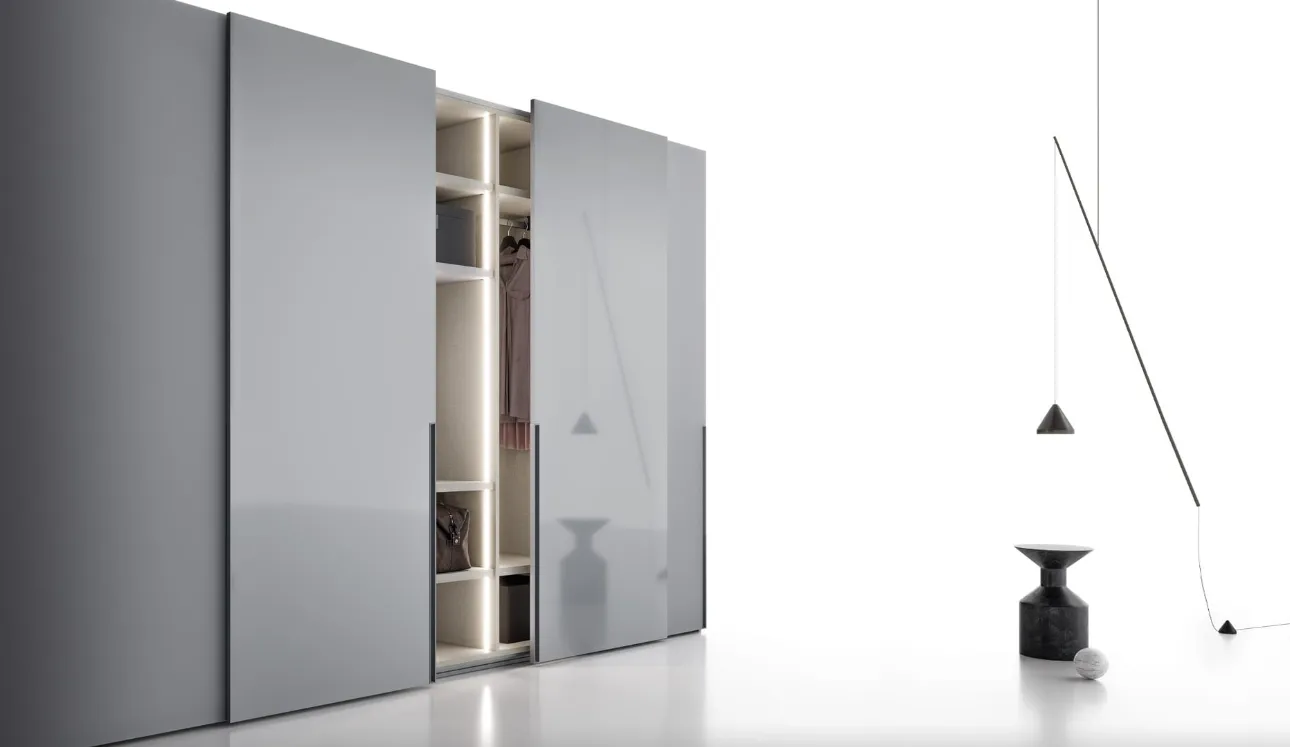 Les armoires d'angle avec portes coulissantes sont des éléments indispensables dans la zone nuit, pour la rendre bien aménagée, fonctionnelle et complète de tout. Pour meubler parfaitement une pièce belle et de grande qualité, choisissez les plus belles solutions des meilleures marques, lits, armoires et tables de chevet de haute qualité. Contactez-nous et découvrez notre gamme de mobilier maison : vous serez en mesure de finir la zone nuit en profitant d'une diversité de meubles de rangement modernes, comme l'armoire laquée mate sur la photo.