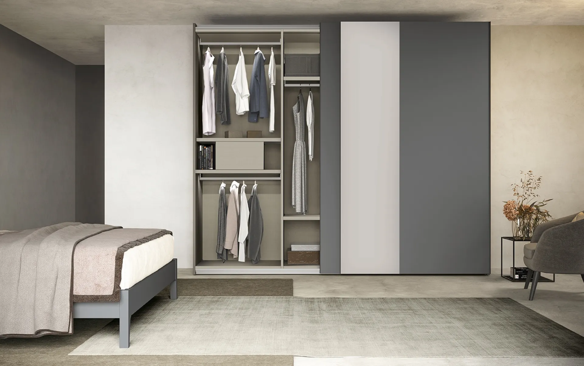 Vous cherchez une armoire en mélaminé ? Cliquez et découvrez les armoires murales avec portes coulissantes de Colombini Casa.