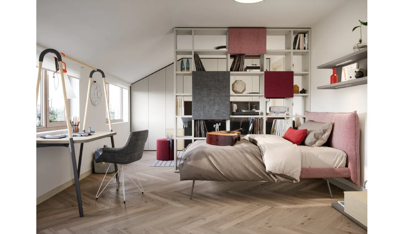 Le lit simple Pillow en tissu sur la photo, parmi les modèles modernes rembourrés de Nidi, est parfait pour assurer une détente totale.
