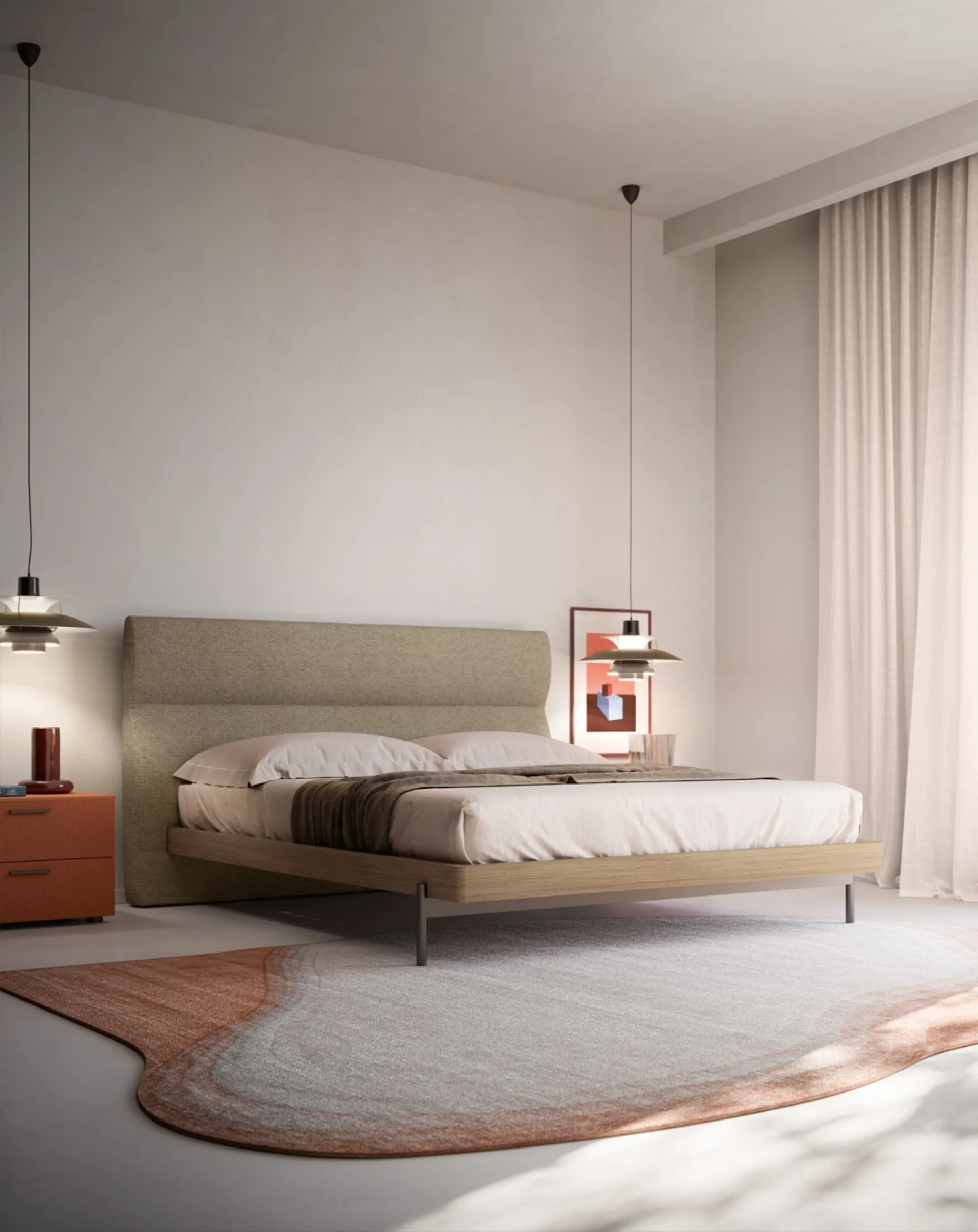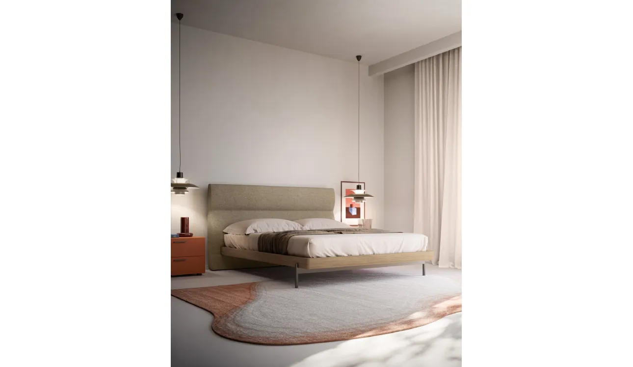 Durabilité des matériaux et grand confort sont les aspects qui caractérisent tous les produits de la marque, y compris le lit en tissu sur la photo.
