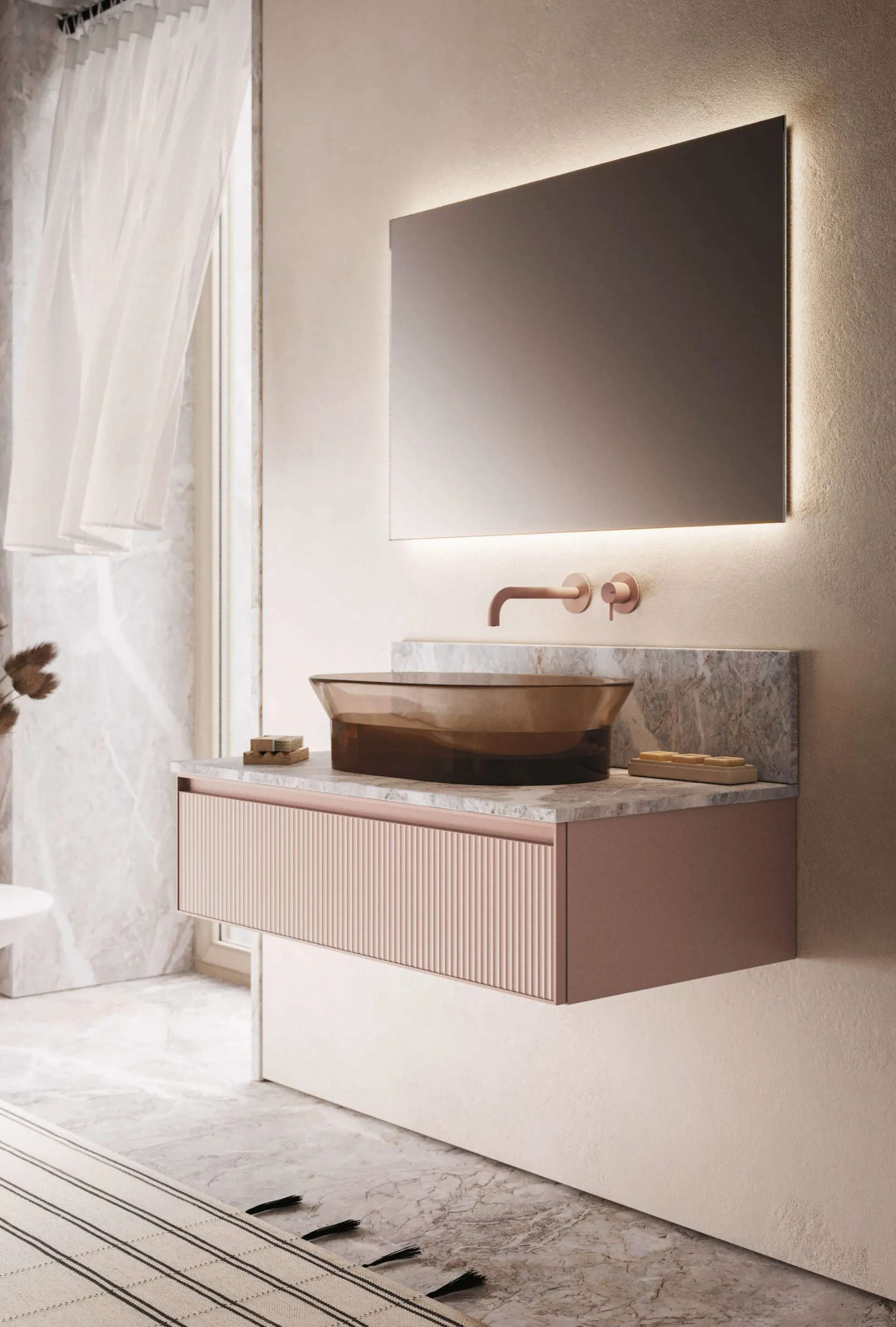 Le modèle de meuble de salle de bain suspendu Absolute 41 d'Arbi en verre fait partie de la gamme complète de mobilier pour la salle de bain de l'entreprise, toujours d'une grande valeur esthétique. En magasin, vous pourrez voir les plus belles compositions de mobilier de la célèbre et connue marque en personne : nous vous attendons pour aménager ensemble votre salle de bain. Des matières premières de qualité et une riche variété de couleurs garantissent une conception unique et des matériaux de qualité qui résistent à différentes substances. Agréable et indispensable dans toute salle de bain, un modèle en verre design comme celui sur la photo répondra à tous vos besoins habitationnels. Arbi conçoit des projets pour le design de salle de bain avec des meubles de salle de bain suspendus alliant design unique et grande ergonomie, comme cet intérieur le nécessite.