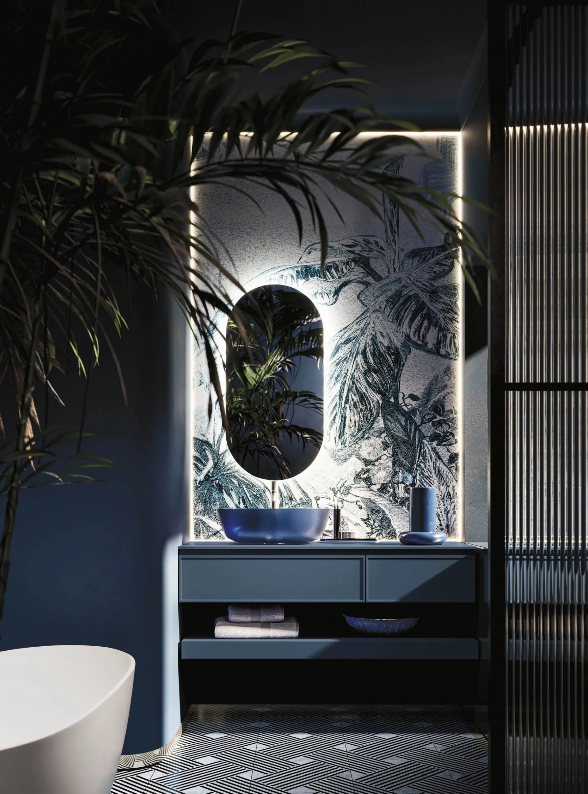 Meuble de salle de bain suspendu Décor Blue Forest d'Arbi : cliquez pour obtenir des informations sur les meubles de salle de bain suspendus laqués mats et les accessoires de la marque.