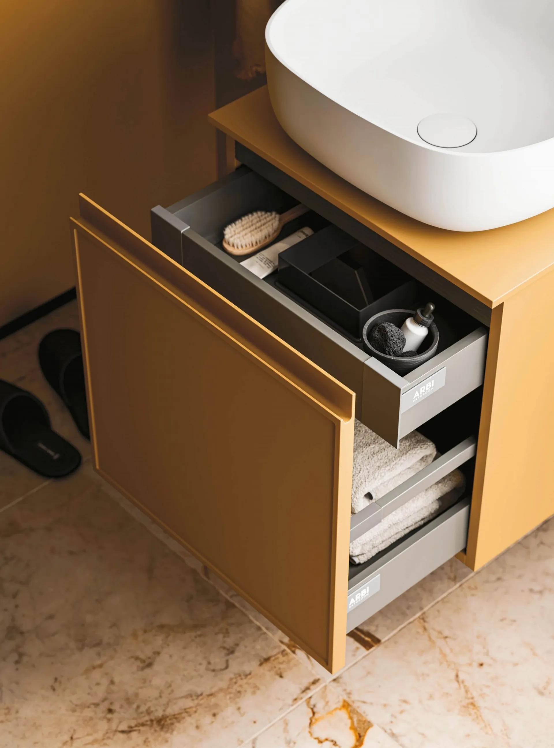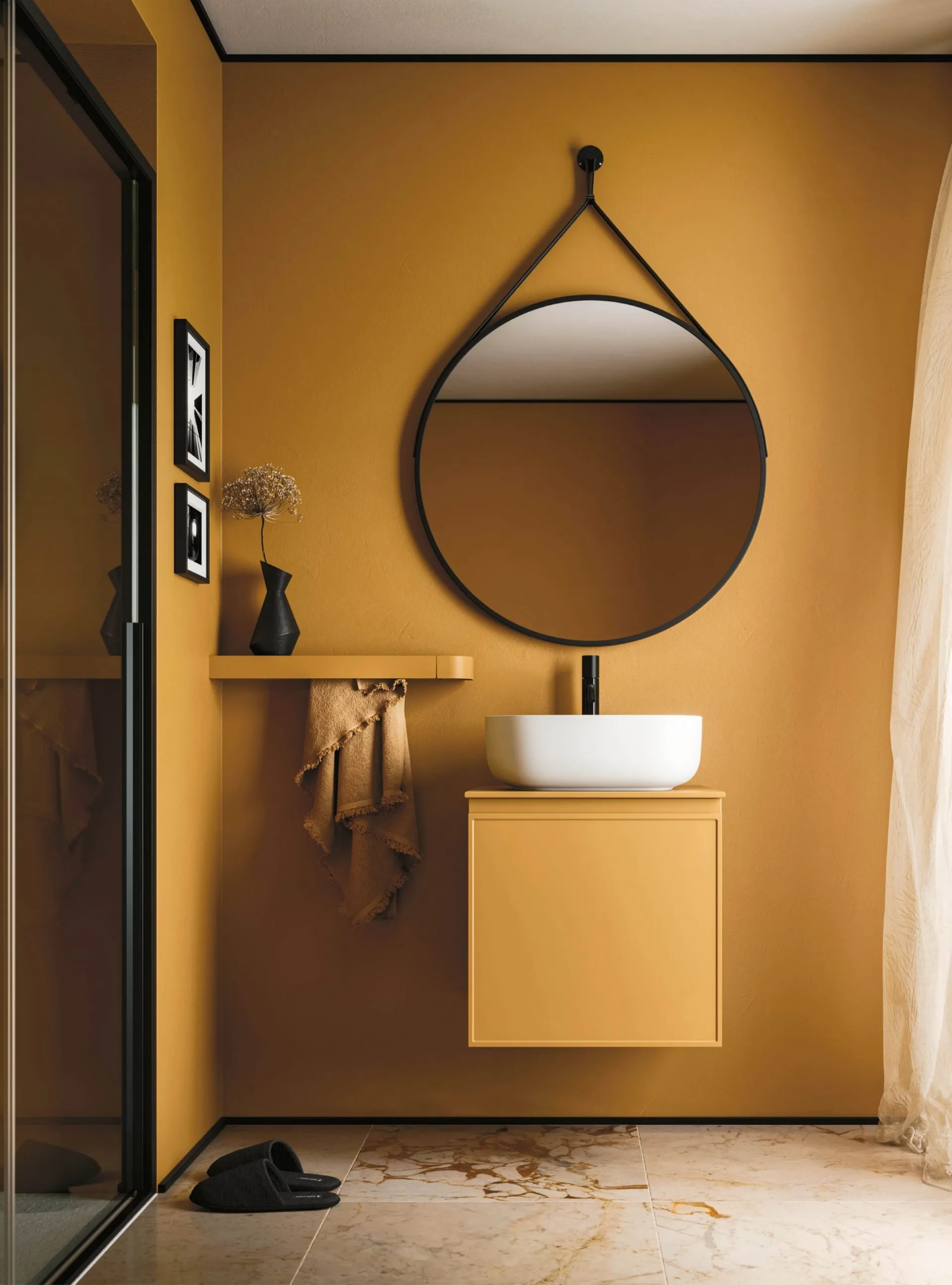 Meubles de salle de bain suspendus Decor Cozy jaune d'Arbi : découvrez la Décoration de salle de bain moderne laquée mate et amén
