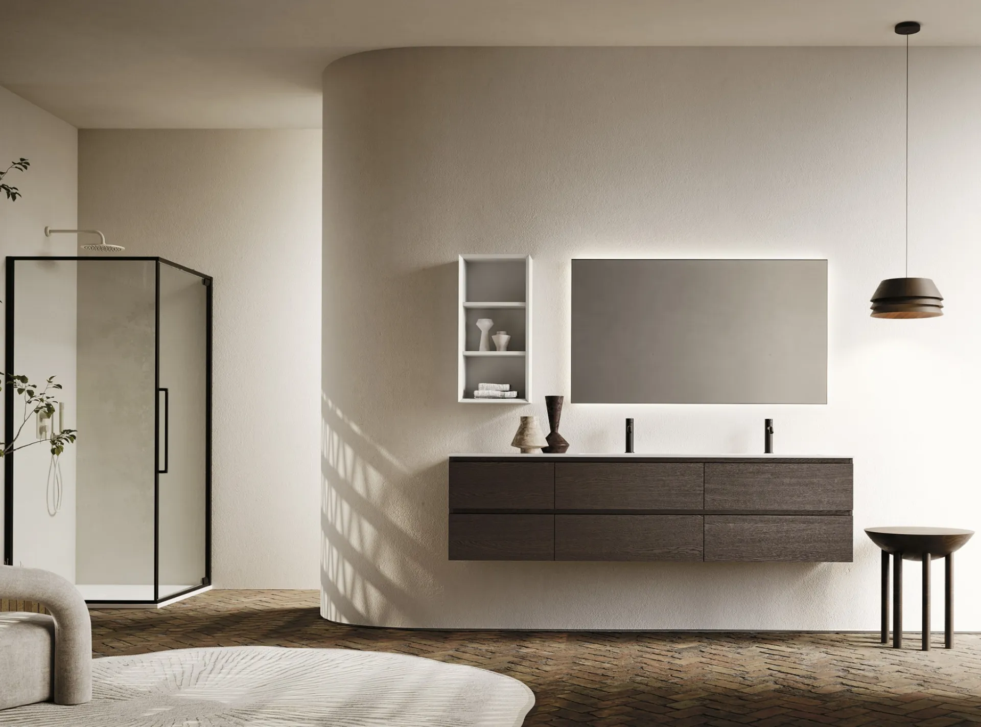 Décorez parfaitement votre salle de bain moderne avec Sky Gola 39, des meubles suspendus et des accessoires en bois d'Arbi.