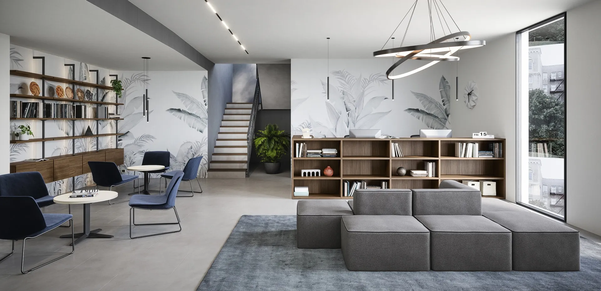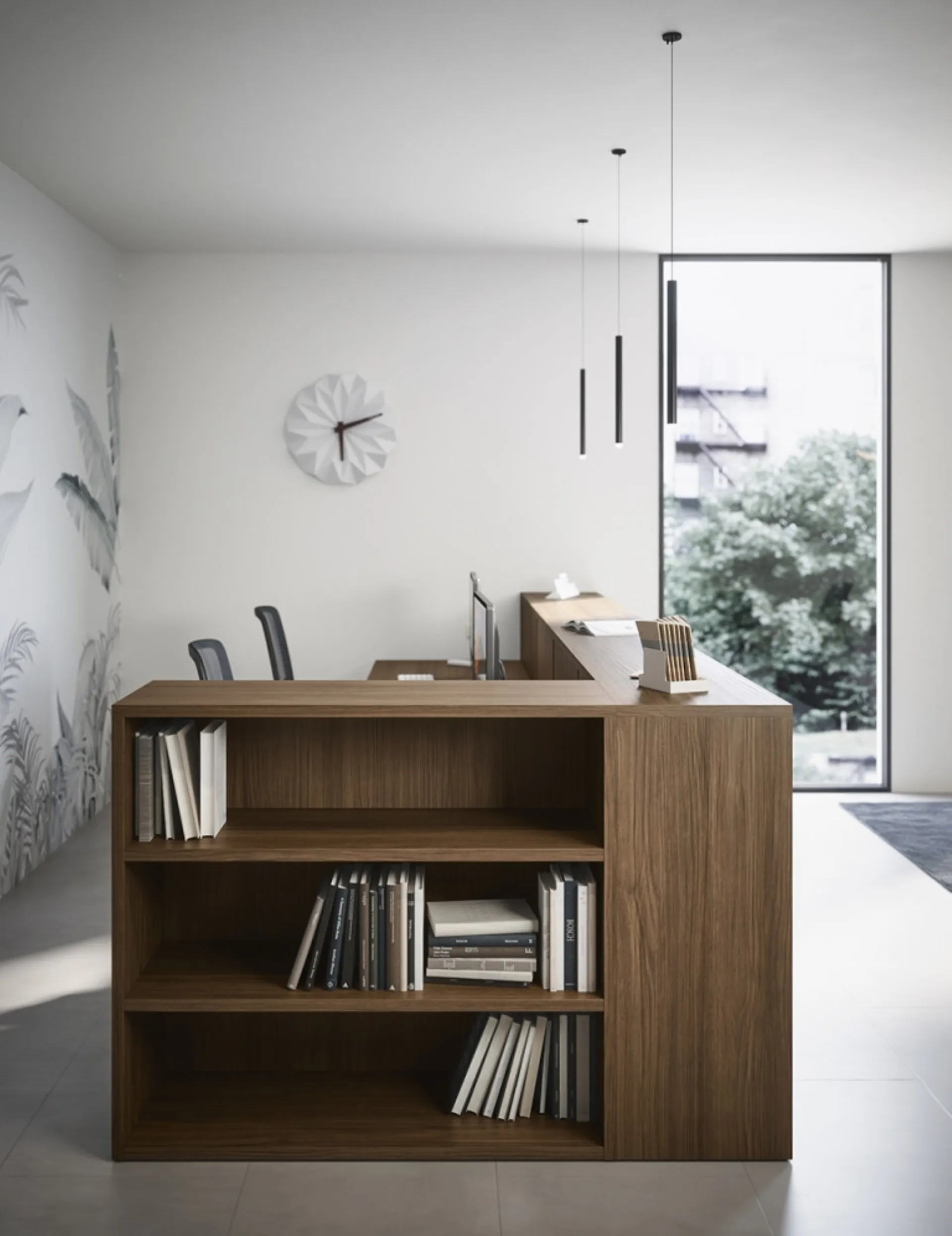 Si vous souhaitez compléter l'environnement de travail, voici le modèle Bancone Reception 14B de Cinquanta3 parmi différentes propositions de comptoirs de réception.