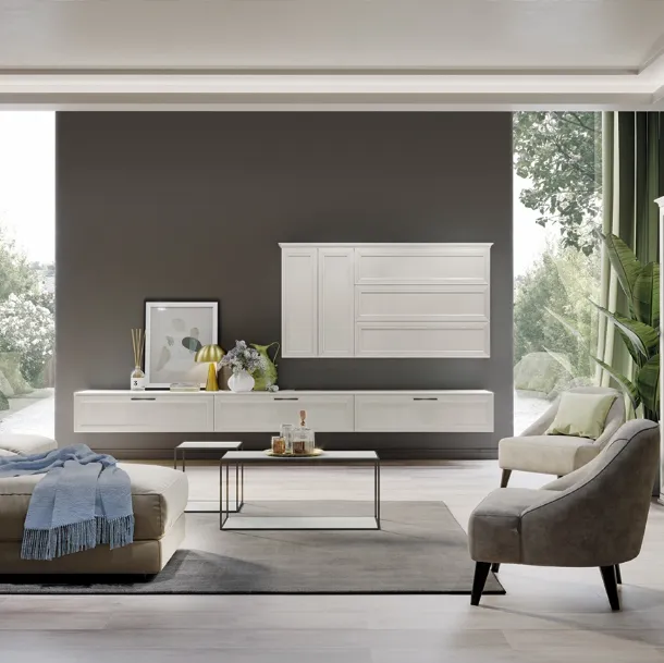 Cliquez et découvrez plus sur le mur équipé Arcadia AS021 de la marque Colombini Casa : c'est la solution aux lignes classiques idéale pour vous.