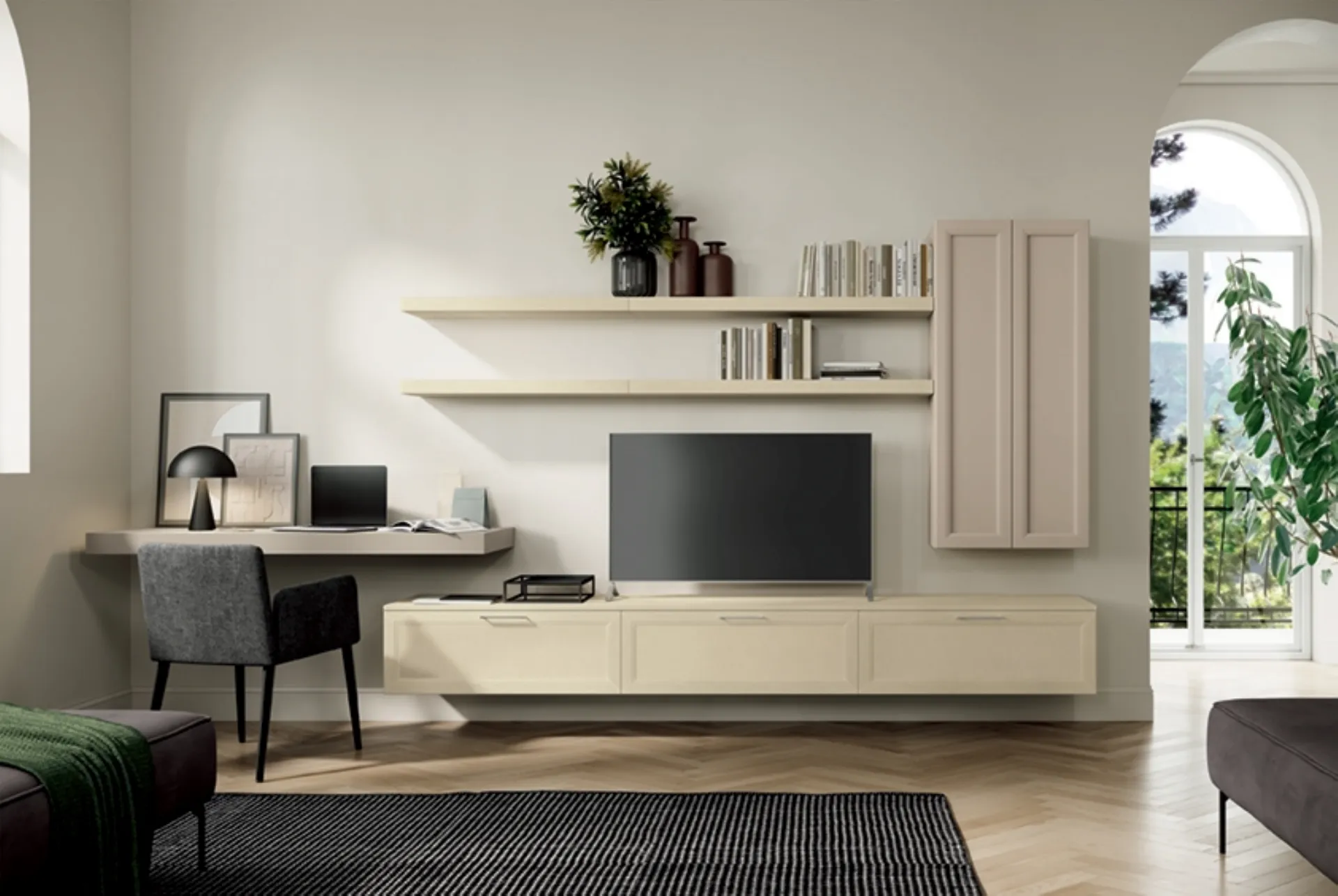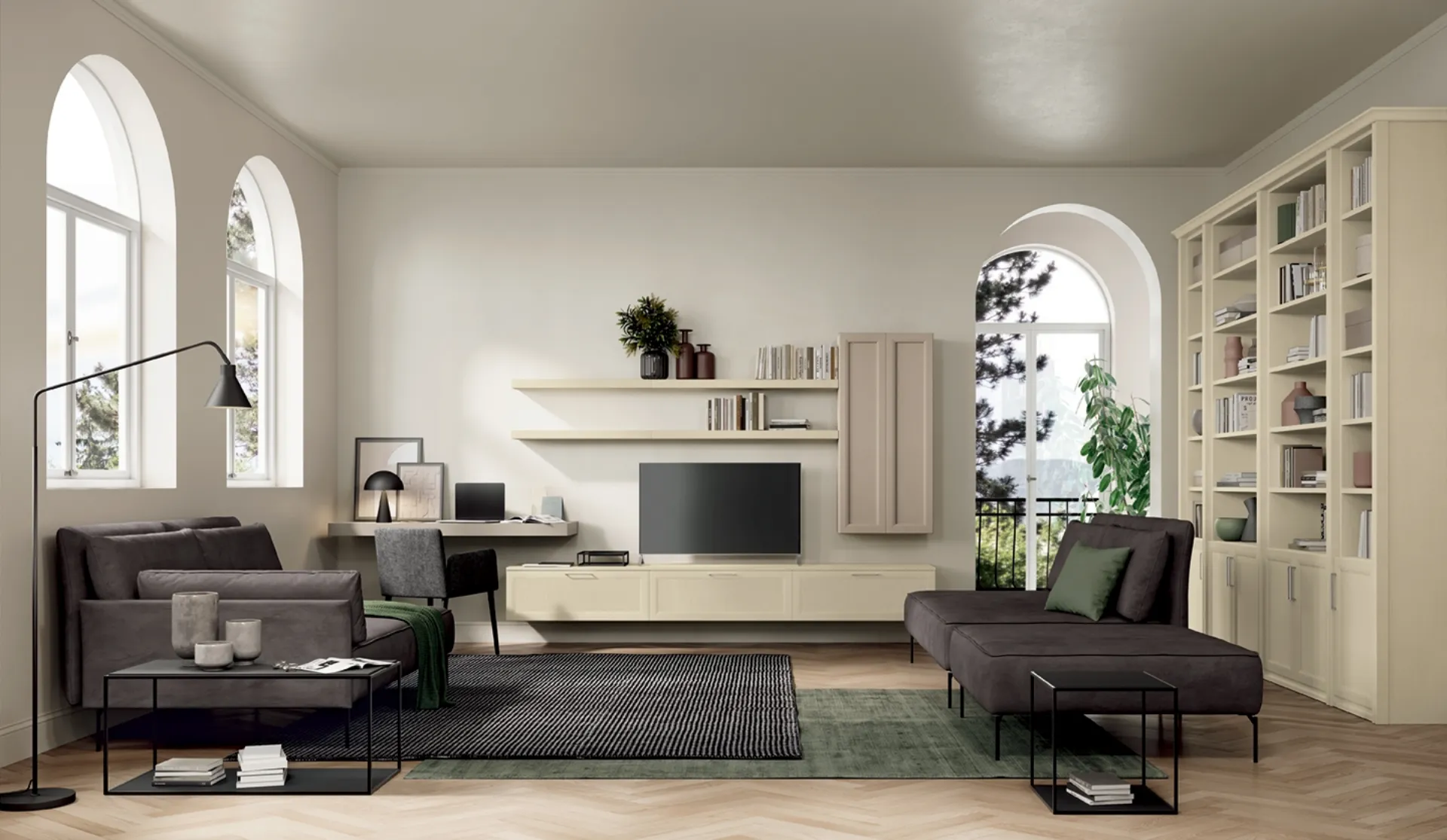 Veux-tu meubler un salon pratique et fonctionnel? Voici pour toi le mur équipé Arcadia AS004 de Colombini Casa avec ses formes classiques et marquées.