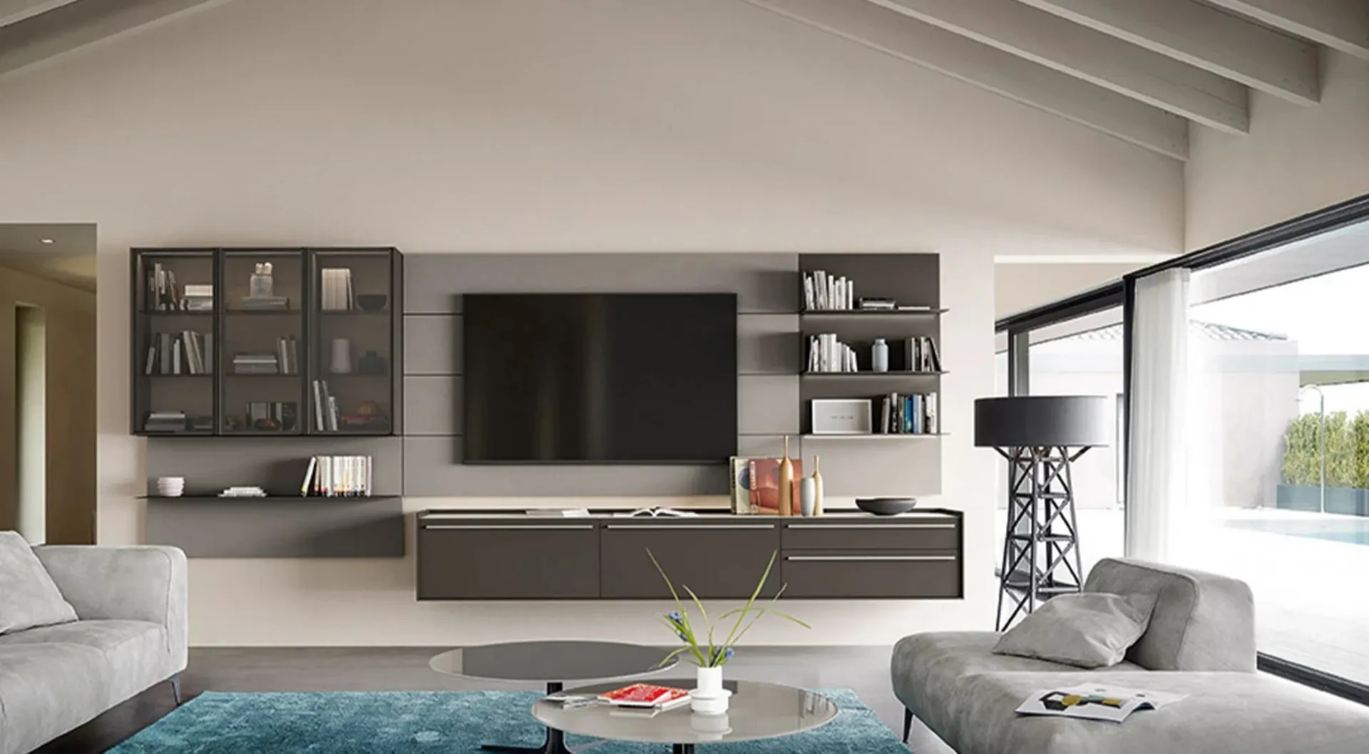 Cliquez ici pour en savoir plus sur le mur équipé Cabaret One 02 de la marque Sangiacomo : c'est la solution aux lignes modernes parfaite pour vous.