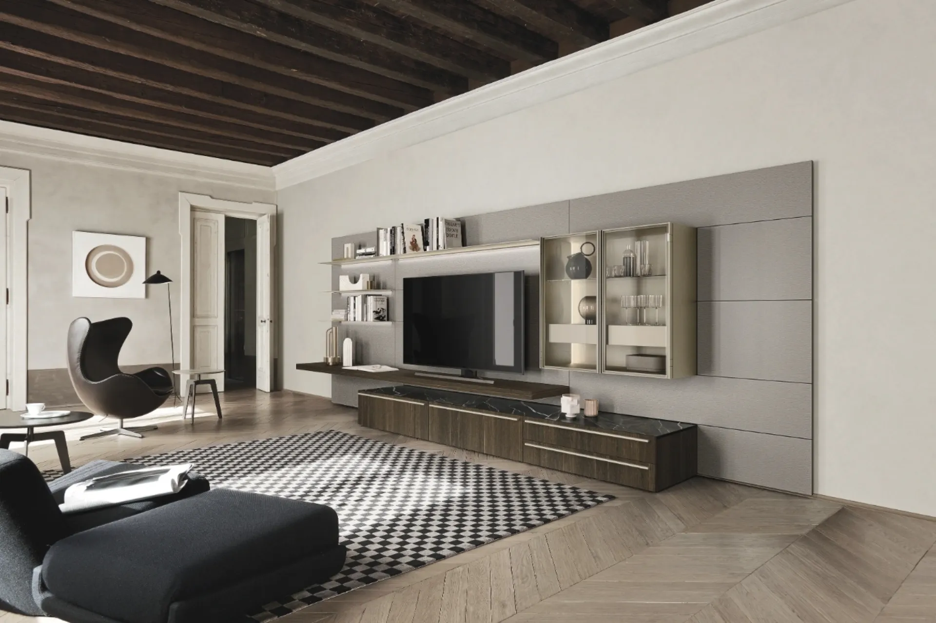Les murs équipés modernes permettent de recréer différentes atmosphères dans le salon, libérant de l'espace et utilisant au mieux chaque coin.