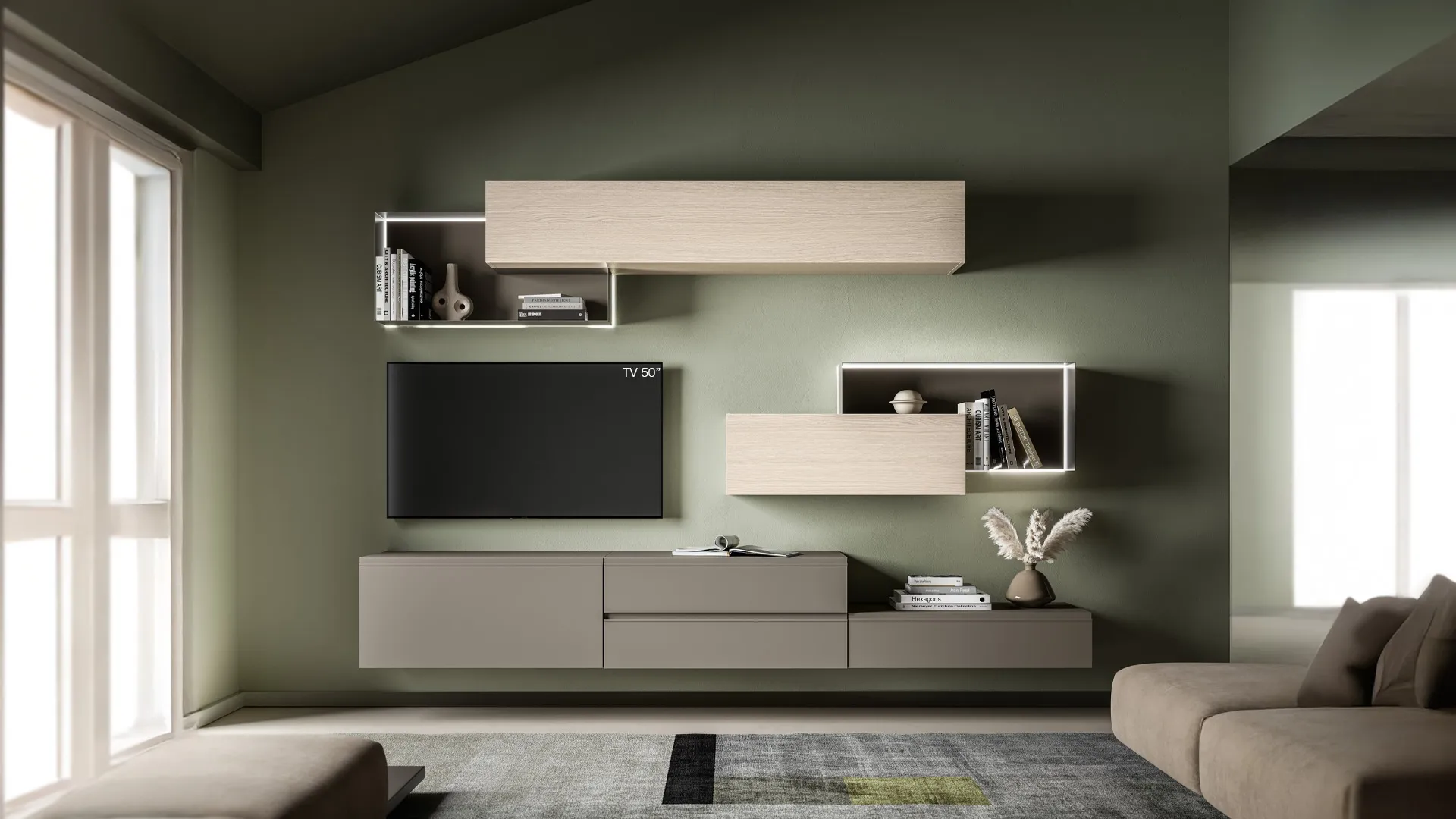 Vous souhaitez créer un salon pratique et dynamique ? Voici pour vous le mur équipé Pratico PTG433 SantaLucia aux formes modernes et résolues.