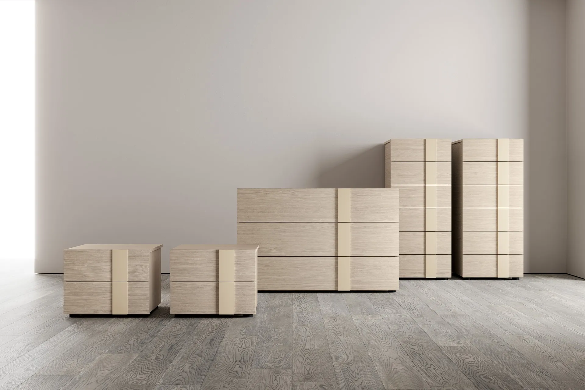 Veux-tu meubler la chambre avec des tables de nuit et des meubles à tiroirs de SantaLucia? Voici le modèle Alfy Gruppo Notte en mélaminé pour des espaces modernes