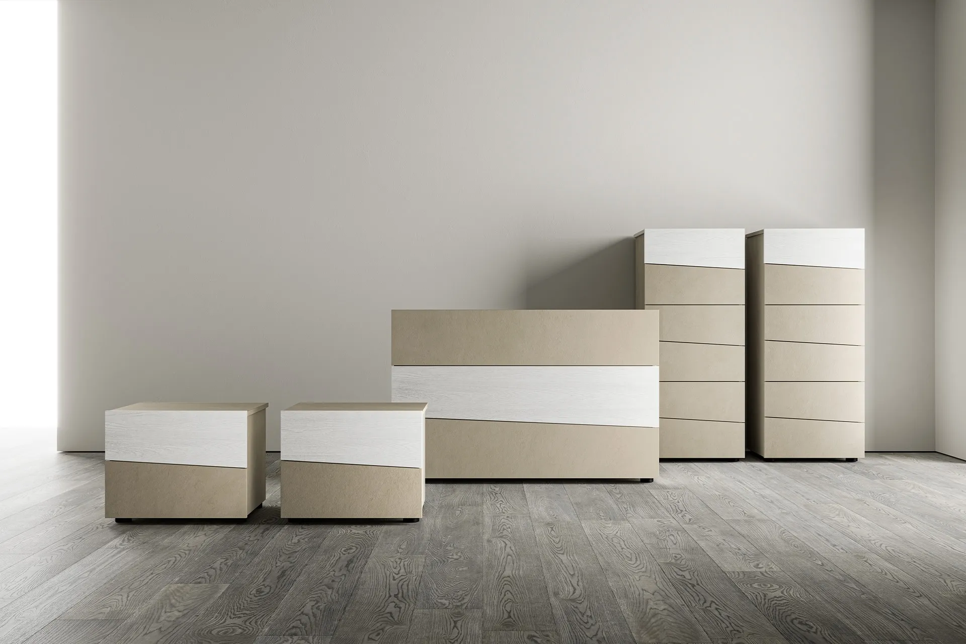Optimisez vos espaces en choisissant des compositions d'éléments assortis ou en recréant des associations de styles et de couleurs uniques en vous appuyant sur le catalogue de meubles et d'accessoires pour la chambre à coucher que nous proposons, comme le modèle en mélaminé visible sur la photo, également réalisable sur mesure pour vous. Avec nos ensembles de nuit modernes de la marque SantaLucia, spécialiste de l'Ameublement Maison pour la chambre à coucher, vous pourrez recréer la chambre à coucher de vos rêves. Groupe de nuit Ambra de SantaLucia : contactez-nous et découvrez-en plus sur nos propositions d'aménagement et aménagez la chambre comme vous l'avez toujours imaginée.