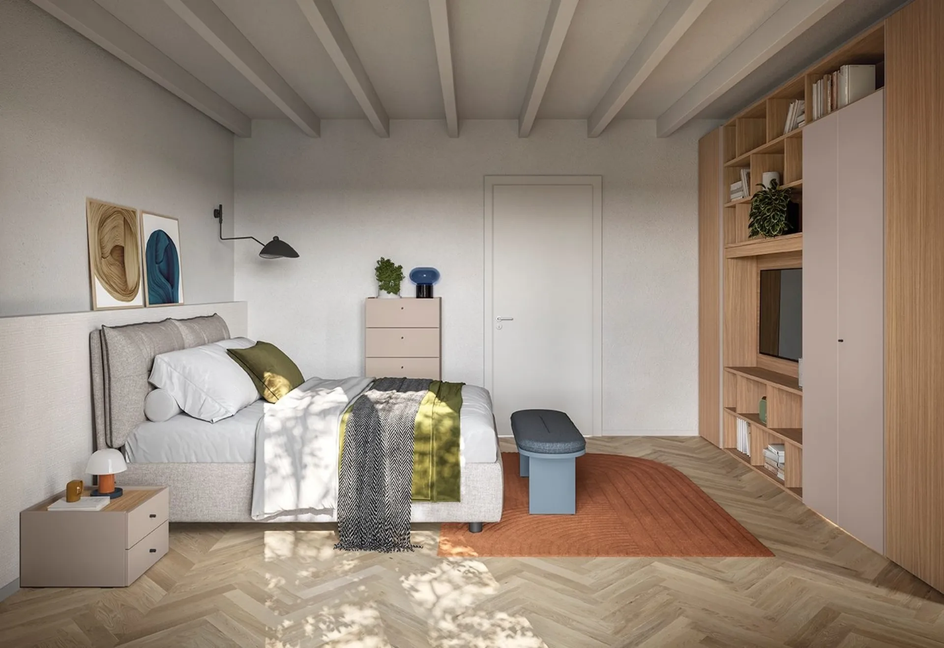 Tu te demandes comment assortir des lits, des armoires et des commodes ? Avec le modèle de Colombini Casa visible sur la photo, tu auras un ameublement parfait pour un espace au style moderne. Les tables de nuit sont des meubles capables de compléter la chambre en offrant un espace de rangement sûrement utile et polyvalent.