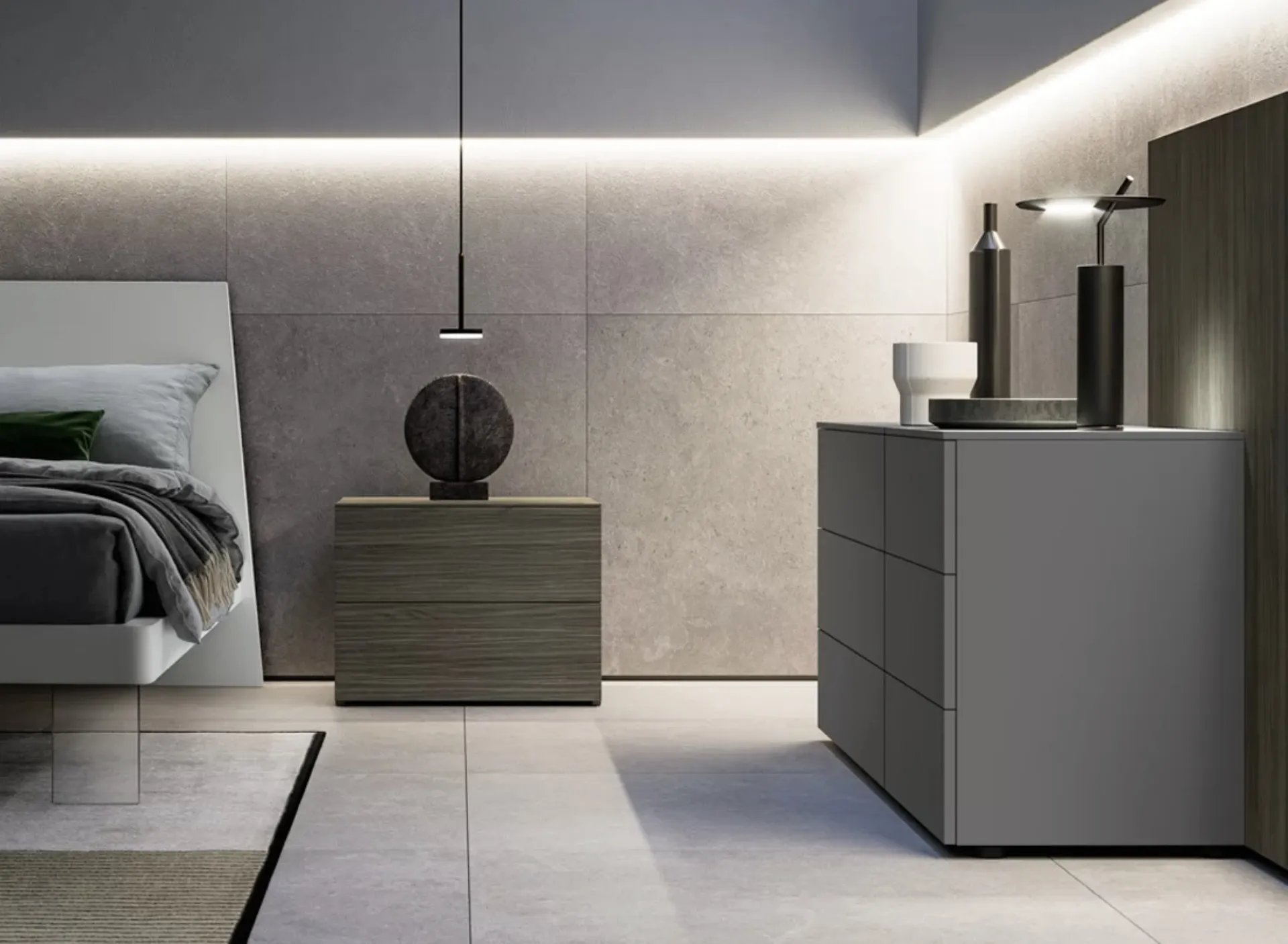 Un riche catalogue de meubles avec des tiroirs SantaLucia : les tables de chevet modernes en mélaminé, comme le Chevet Matwood du Système Ventidue, font partie des propositions les plus originales.